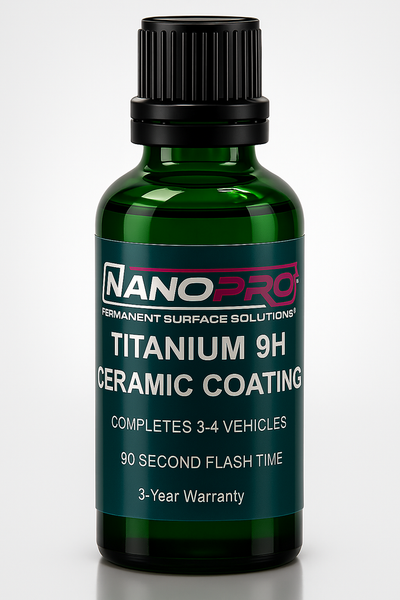 NanoPro Titanium 9H Ceramic Coating an absolute 9H scratch-proof ceramic coating (hydrophobic). This ceramic car coating contains extreme hydrophobic effects and is sure to leave your car with a solid coating and no scratch body. Has additional catalysts that withstand brunt force; ideal for hoods and commercial vehicles.